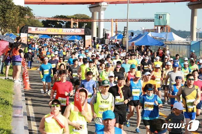 | 8월 29일 개최 예정인 사천노을마라톤 대회가 코로나19 확산 방지를 위해 취소됐다. 사천노을마라톤 대회 장면. © 뉴스1 |