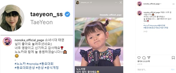 태연의 응원에 노노카 측도 태연의 인스타그램 스토리를 공유하며 "좋아해 주셔서 감사합니다"라는 인사를 남겼는데요, 앞서 태연은 노래 영상을 올리기 전에 노노카의 인스타그램 게시물에 '좋아요'를 누르며 팬심을 드러내기도 했습니다. 이에 노노카 측은 "소녀시대 태연 님이 좋아요를 눌러주셨다. 너무 영광이고 신기하고 감사하다"는 글을 올렸습니다.