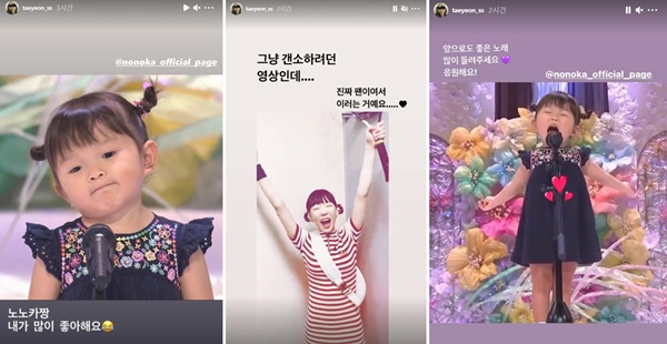 오늘(19일) 태연은 자신의 인스타그램 스토리에 "개인 소장하려던 영상인데 진짜 팬이라서 이러는 거예요"라며 영상 하나를 올렸습니다. 영상에서 태연은 치명적인 귀여움으로 큰 화제를 모았던 노노카의 동요 대회 곡 '강아지 순경'을 따라 불렀는데요, 태연은 노노카와 똑같은 양갈래 머리를 하고 등장해 노노카의 하이라이트 동작을 따라하며 귀여운 매력을 뽐냈습니다.