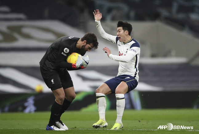 | 손흥민(오른쪽)이 알리송 골키퍼가 공을 잡자 항의하고 있다. /AFPBBNews=뉴스1 |