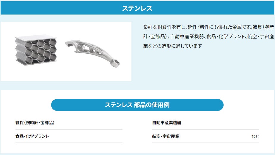 アルミ・ステンレス・チタンは金属の3Dプリントにおける主力素材ですが、樹脂系の素材に比べて非常に高価なため、利用が限定的でした。そこで今回、より多くの人が金属造形を活用しやすくするために、半額キャンペーンを実施するとともに、ステンレスにおいては、製造機材の見直しによるさらなるコストダウンを実現しました。